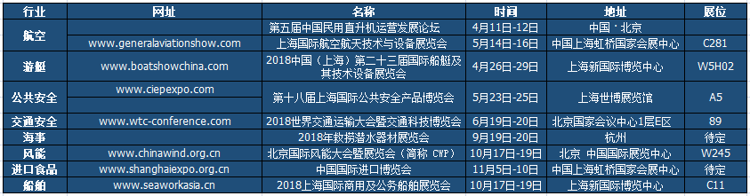 | 船舶 | www.seaworkasia.cn | 2018上海國(guó)際商用及公務(wù)船舶展覽會(huì) | 10月17日-19日 | 上海新國(guó)際博覽中心 | C11 |