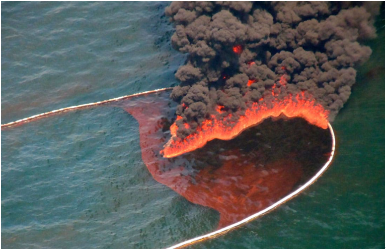 此法是直接燃燒掉漂浮在水面的溢油,可有效清除98%以上的溢油,是所有方法中效率最高的。