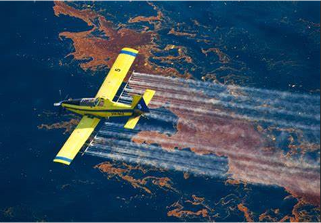 溢油一般會在海面形成油膜,但在潮汐和洋流的作用下,有的污油會被打散并黏附在水柱中,該過程就是污油的分散,通過使用分散劑可大大提高分散率。分散劑,比如Corexit 9500是一種化學(xué)物質(zhì),通過直升機(jī)或船艇噴灑到溢油區(qū)域,從而自然分解污油成分。