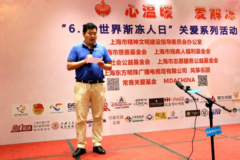飛溢汽車的于宏總經(jīng)理是活動(dòng)資深的支持者,多年來他的車隊(duì)每年“世界漸凍人日”在上海的街道穿行,接送行動(dòng)非常不便的漸凍人患者來參加活動(dòng)。去年他啟動(dòng)了一個(gè)關(guān)愛項(xiàng)目,他們公司每洗一輛車就代客戶為MDA捐獻(xiàn)一元。6月21日,正好是他夫人的生日,同時(shí)今年他的兒子也剛參加了高考,所以他們?nèi)铱倓?dòng)員,都來參加今年的為愛解凍活動(dòng),擔(dān)任志愿者。主辦方特別策劃了漸凍人為志愿者舉行慶生儀式,共享生日蛋糕,分享溫暖祝福。