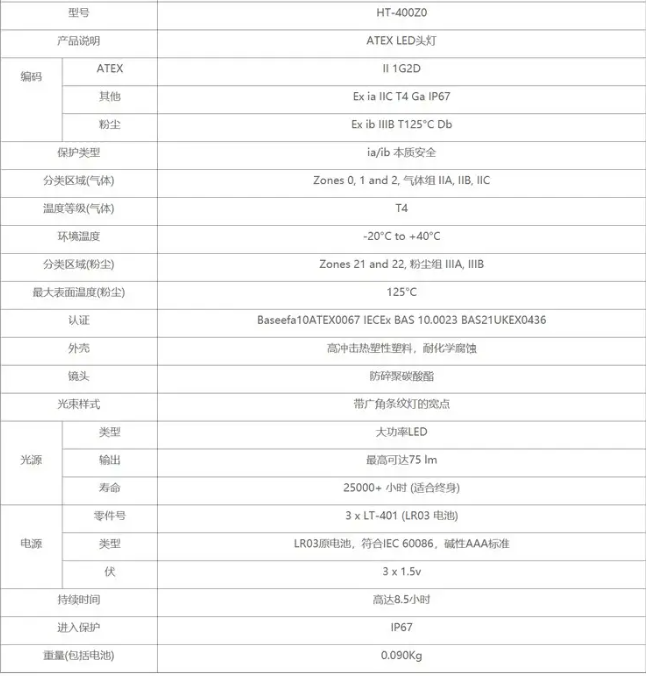 ATEX和IECEx防爆認證頭燈HT-400Z0
